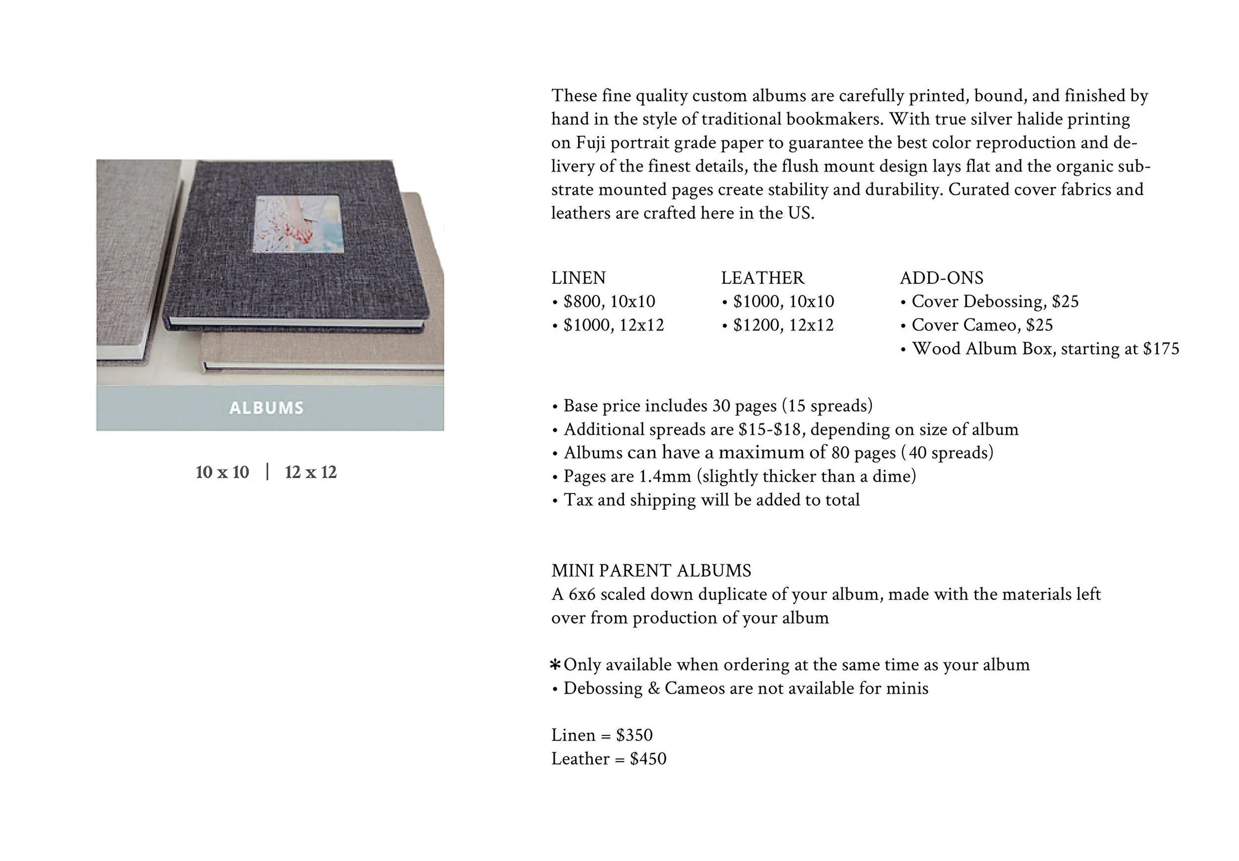 I have combed the album options out there for quality & style. I love the colors of these linens & leathers, and think they will go well with your photos. These albums are priced reasonably because I believe having something that is going to last is important these days due to digital media. Having an archival copy of your images gives peace of mind that your favorite images will last your life time.